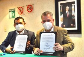 • Firman convenio titulares de Salud y Protección Civil, Francisco Javier Fernández Clamont y Samuel Gutiérrez Macías, respectivamente. Coinciden directivos que, en los hospitales, los pacientes y sus familiares no están exentos de riesgos, este programa fortalece la prevención en Salud.