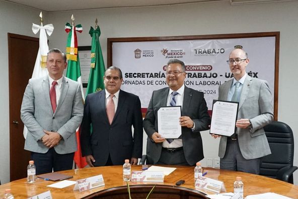 Toluca, Estado de México., 14 de agosto de 2024.- A nombre de la primera Gobernadora de la entidad, la Maestra Delfina Gómez Álvarez, Norberto Morales Poblete, Secretario del Trabajo, firmó con Carlos Eduardo Barrera Díaz, Rector de la Universidad Autónoma del Estado de México (UAEMEX), el convenio ’Jornadas de Conciliación’, que dará salida legal y administrativa para solventar los asuntos laborales de la máxima casa de estudios estatal, que se dirimen en la Junta Local de Conciliación y Arbitraje del Valle de Toluca.